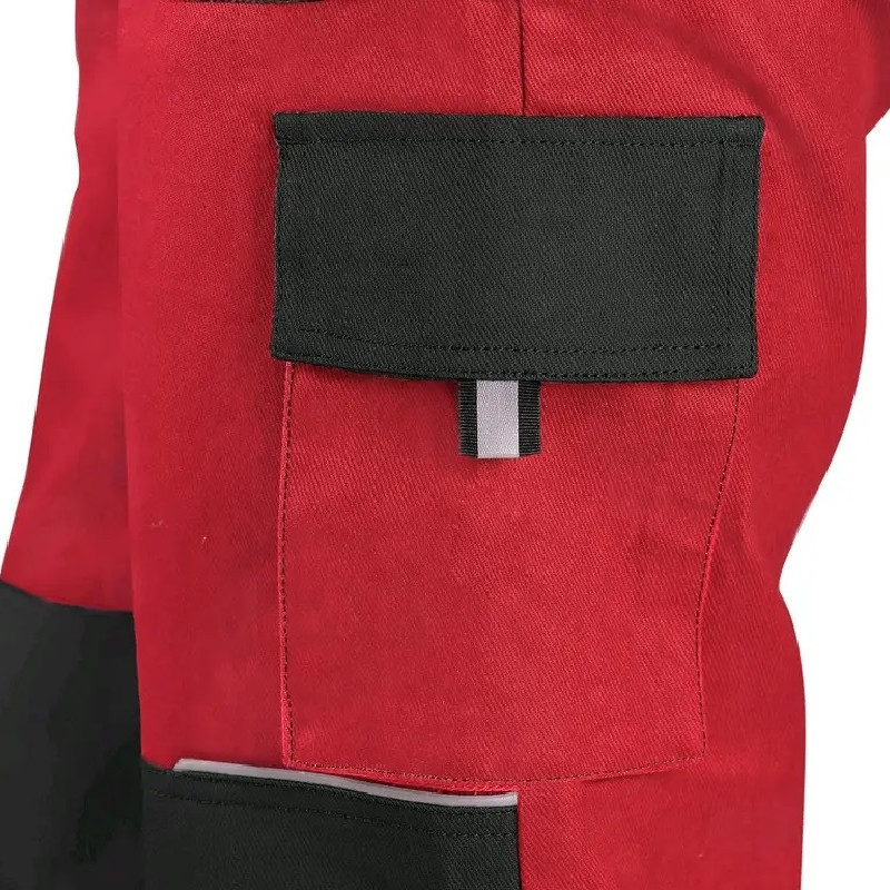 Cu buzunar cu fermoar pe piept, betelie cu banda elastica in partea din spate, buzunare frontale, buzunar lateral pentru ruleta sau metru pliabil, buzunar lateral pentru telefon mobil sau portofel, genunchi dublati pentru durabilitate, buzunar posterior cu clapeta, bretele elastice in partea din spate si elemente reflectorizante.