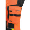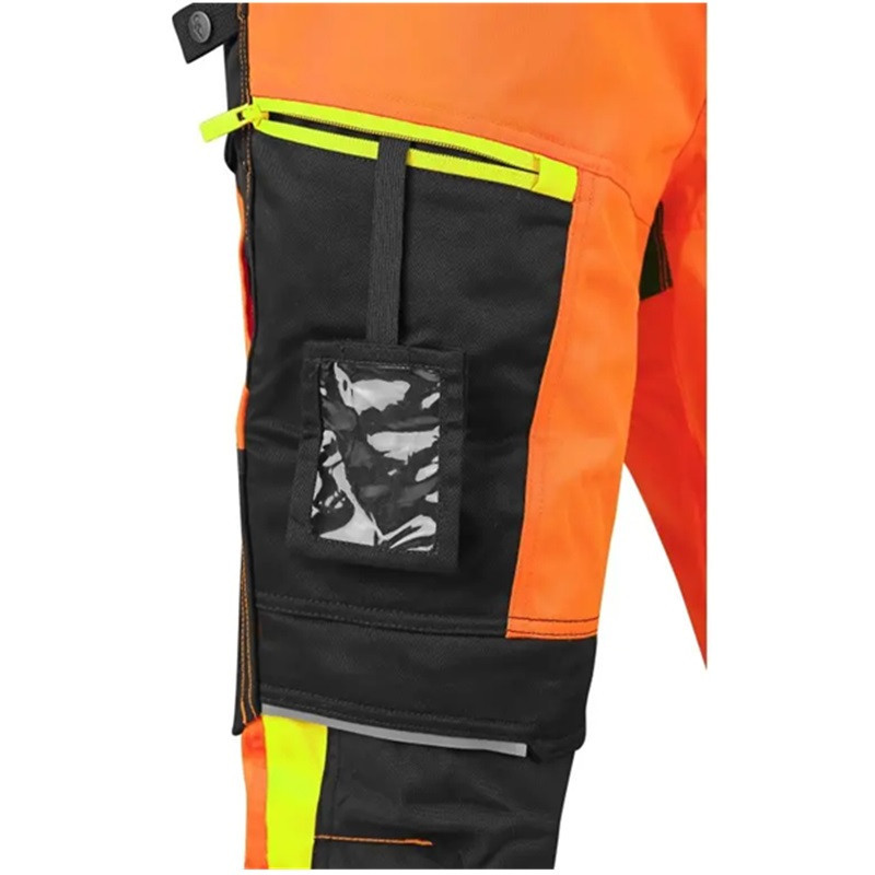 Configuratia de buzunare include doua buzunare frontale, doua buzunare la spate, dintre care unul cu clapeta, buzunare laterale multifunctionale si un buzunar pe coapsa cu fermoar, prevazut cu suport interior pentru card de identificare. Zona genunchilor este ranforsata cu material CORDURA si permite introducerea genunchierelor, oferind durabilitate si confort sporit in lucrul in pozitie ingenuncheata. Tivul inferior este, de asemenea, ranforsat cu CORDURA pentru rezistenta crescuta la uzura. Accesoriile contrastante galben/portocaliu si elementele reflectorizante completeaza vizibilitatea si siguranta in utilizare.